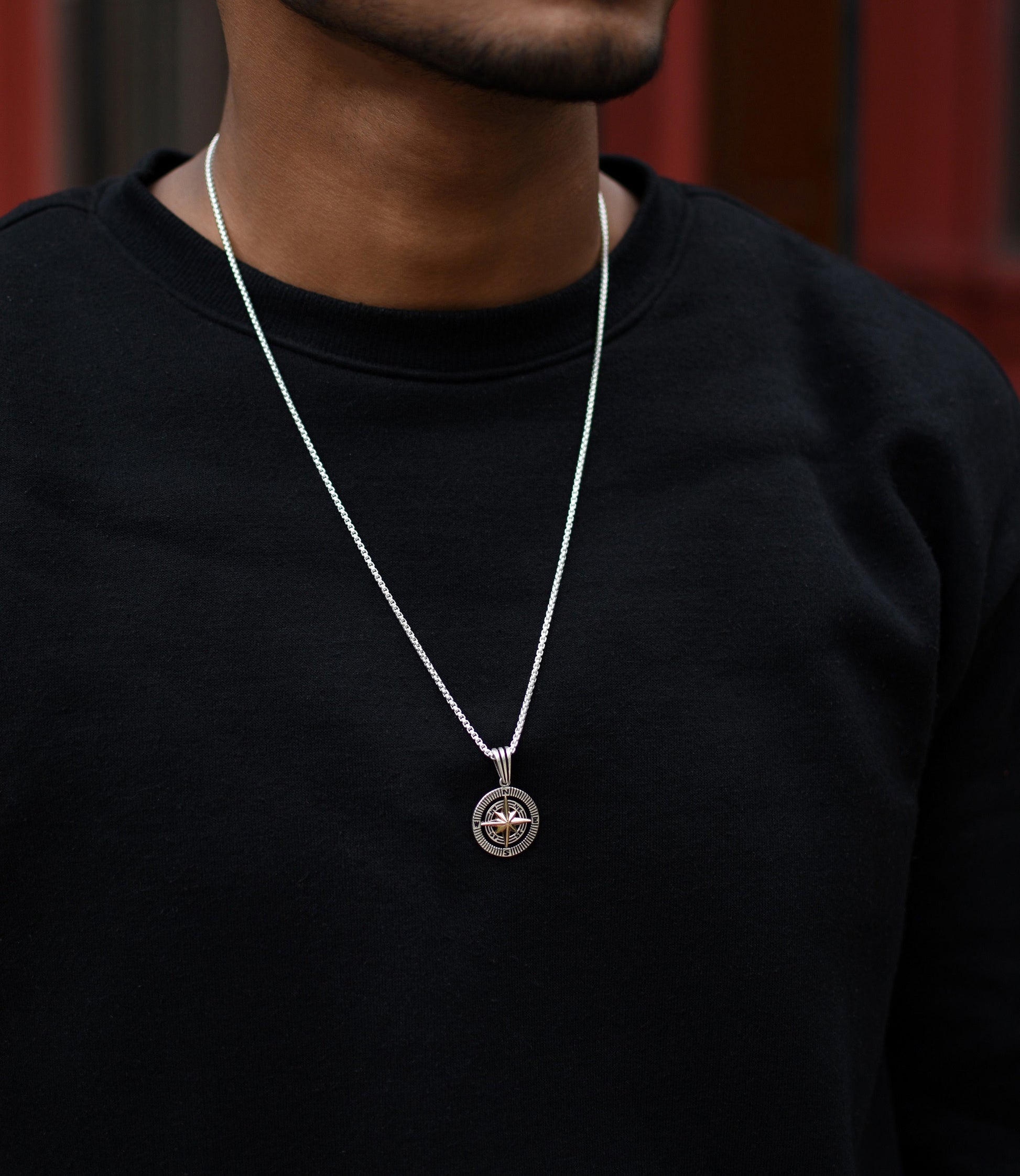 Compass Necklace symbolizes guidance, sense of direction and independence to explore life. This Double-sided compass pendant is made from 925 Hallmarked silver and the centerpiece is made from Bronze.